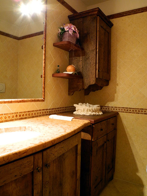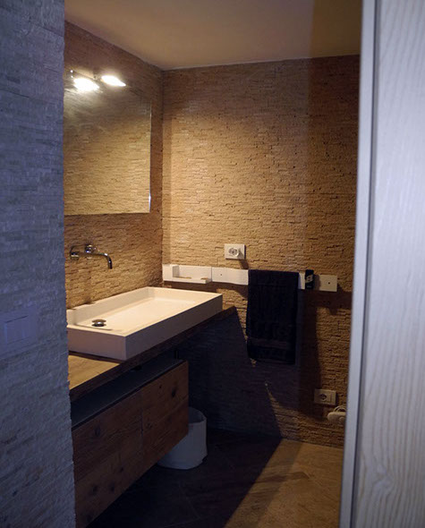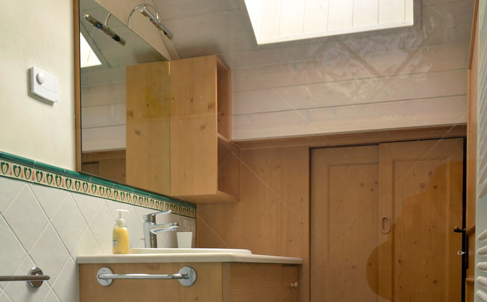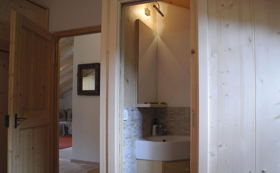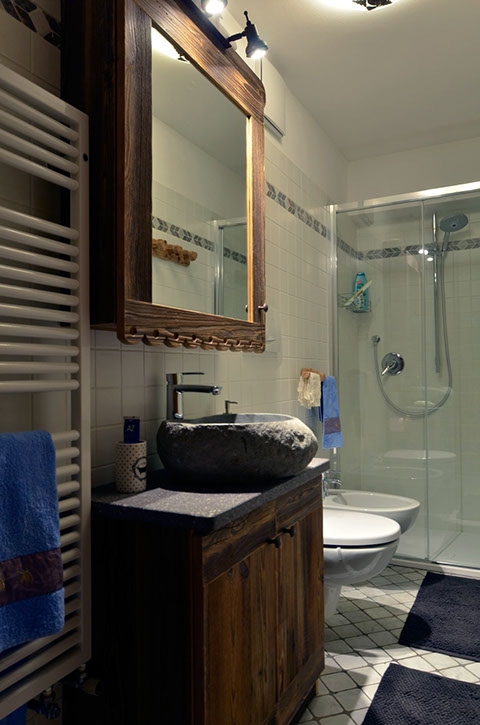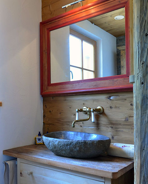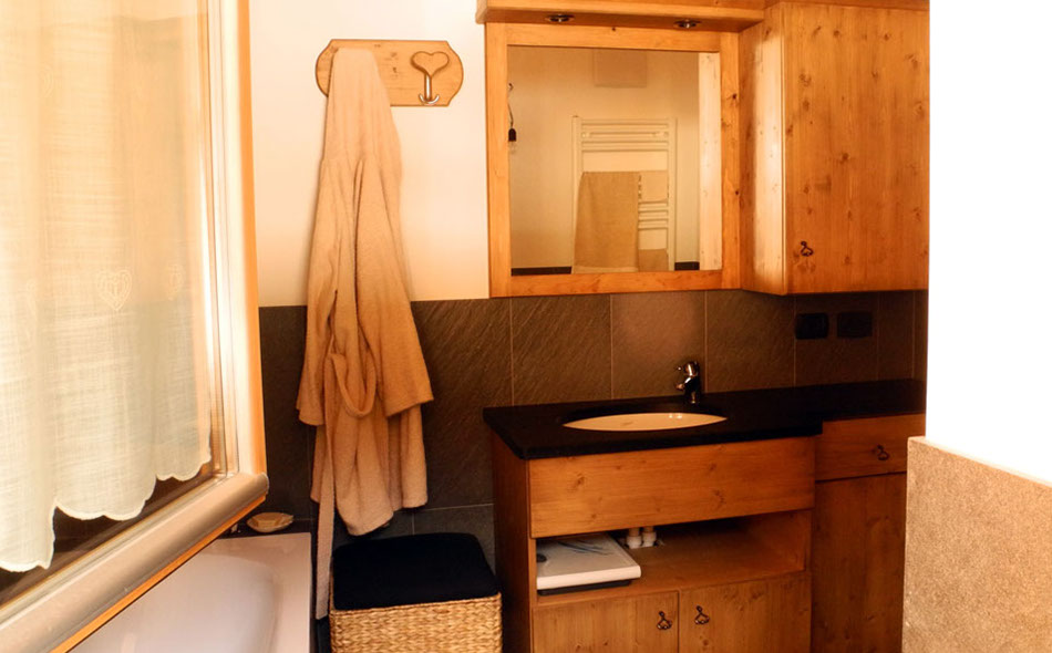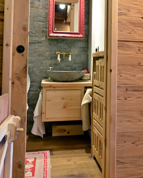 Il mobile in cirmolo, i rivestimenti in pietra, lo specchio contenitore spiritoso.