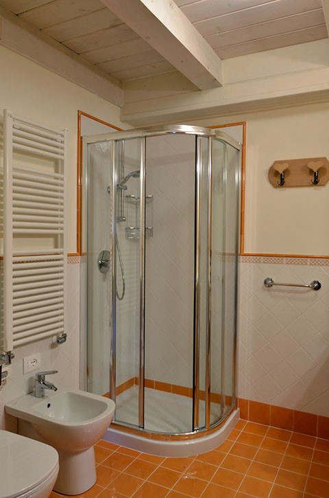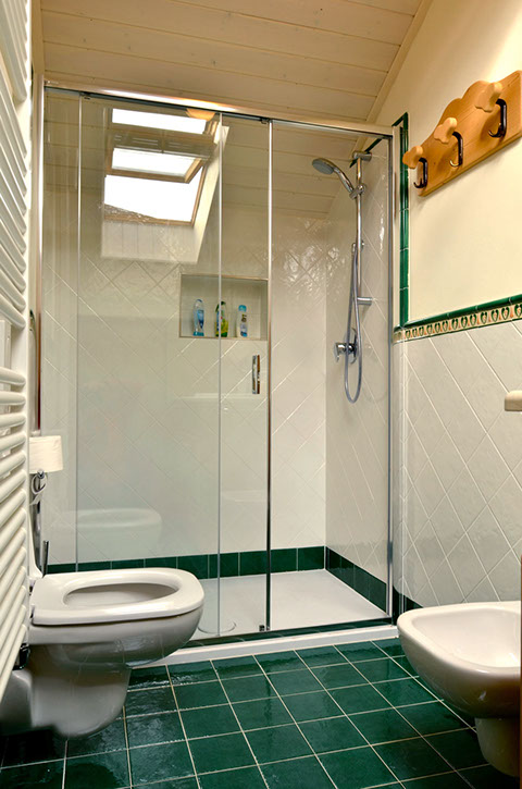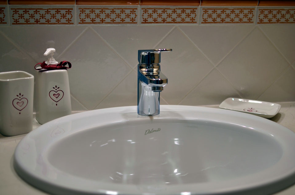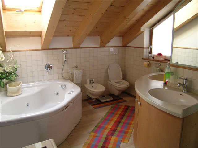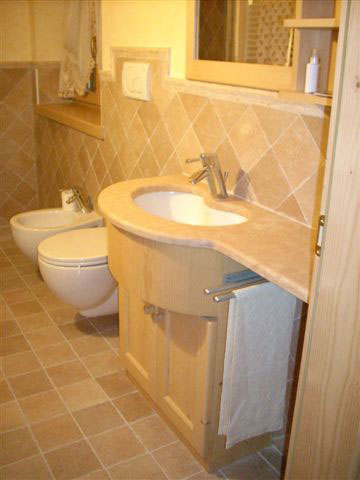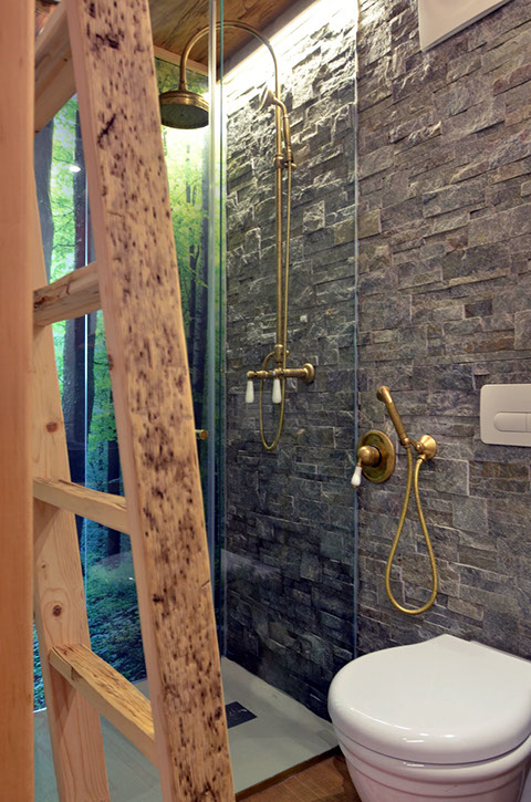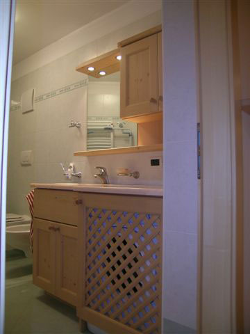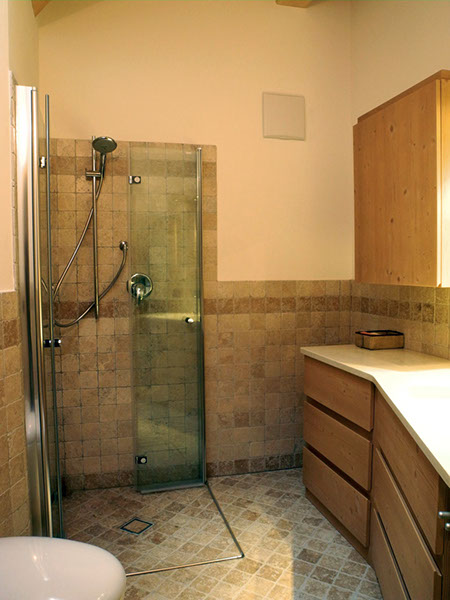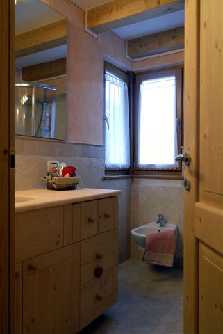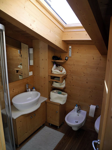Il mobile in cirmolo, i rivestimenti in pietra, lo specchio contenitore spiritoso.