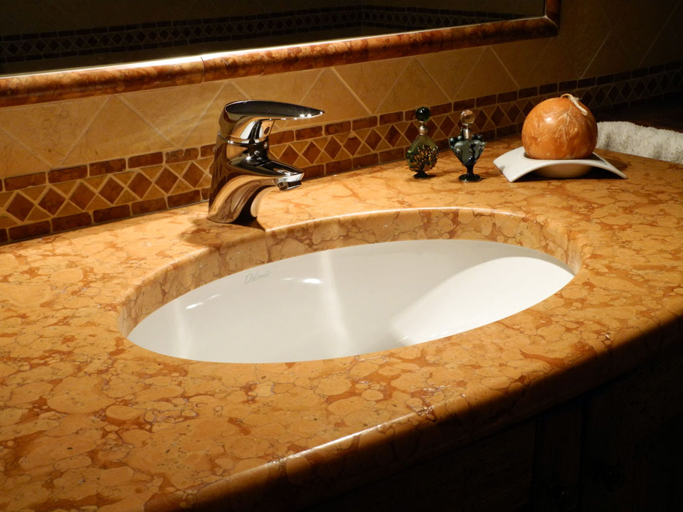 Mobile sottopiano con ante lisce e traverso, top in marmo Rosa perlino spazzolato.