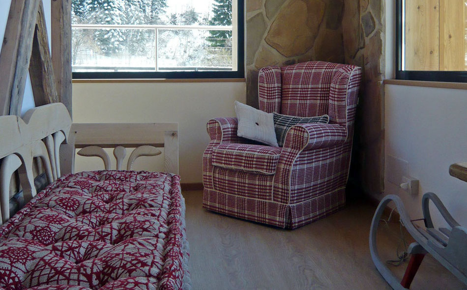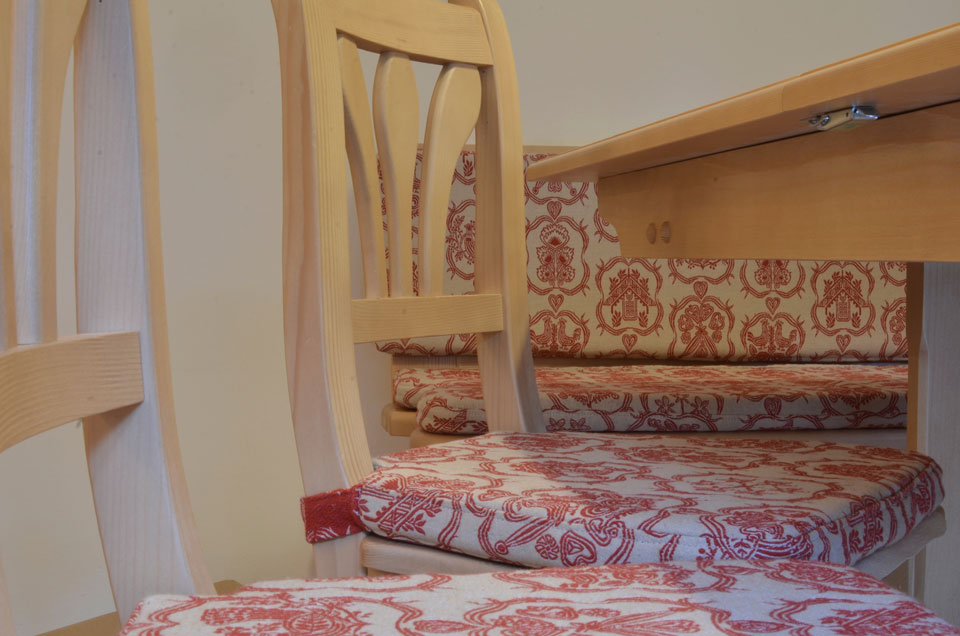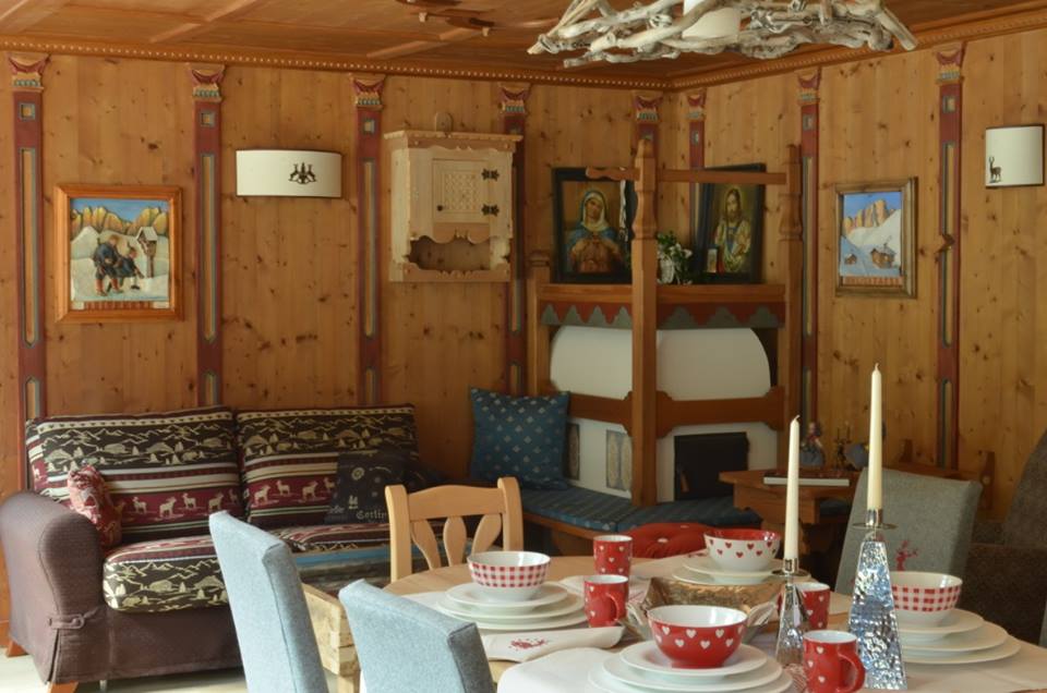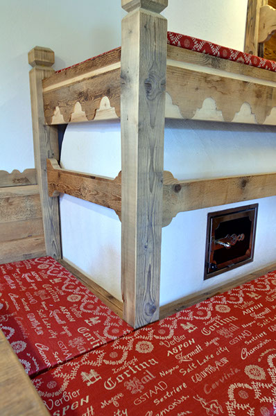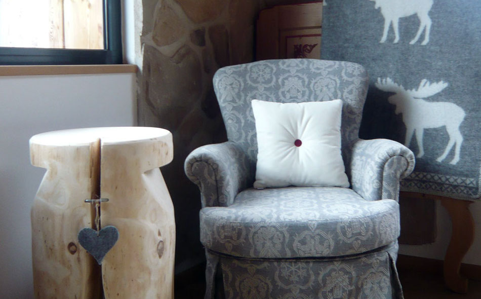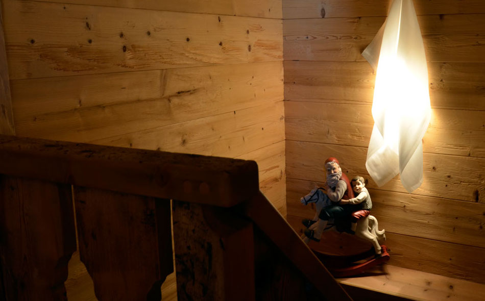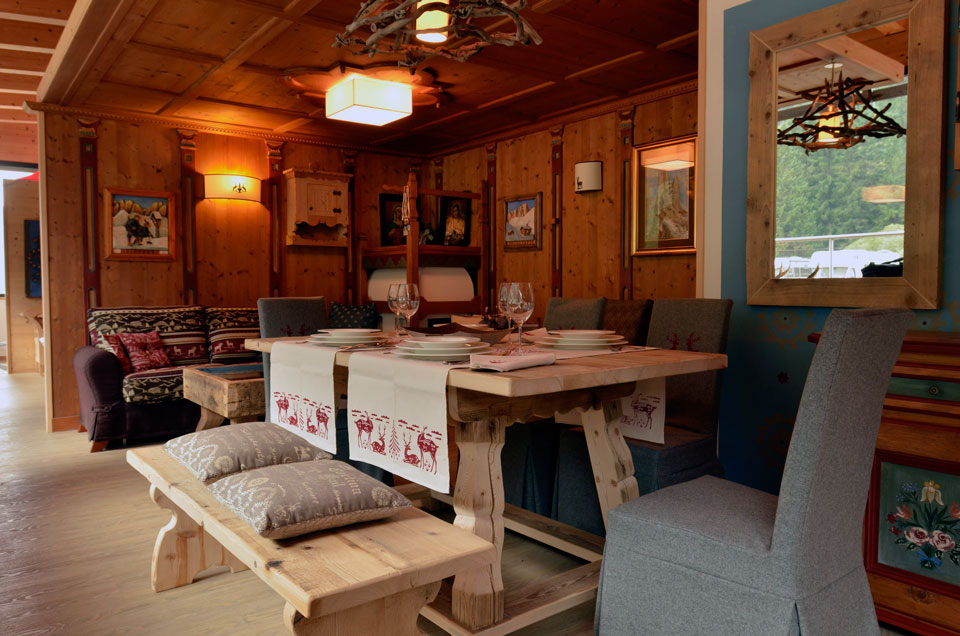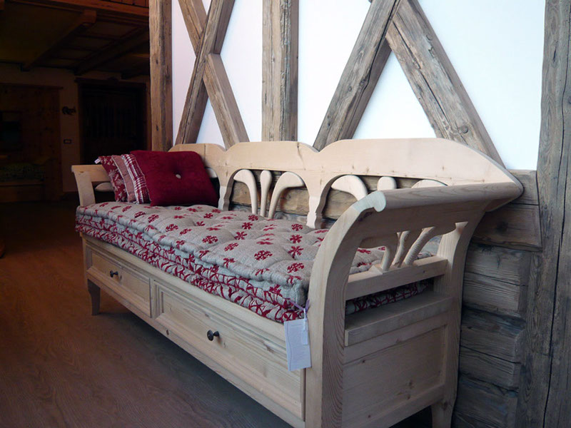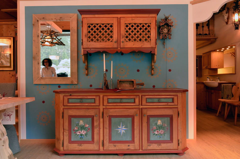 Sono visibili mobili e boiserie in legno massello e in stile in legno di abete, vecchio, antico e di recupero, legno evaporato spaccato con l’ascia, pino cimbro, detto „cirmolo“, legno antico e larice.